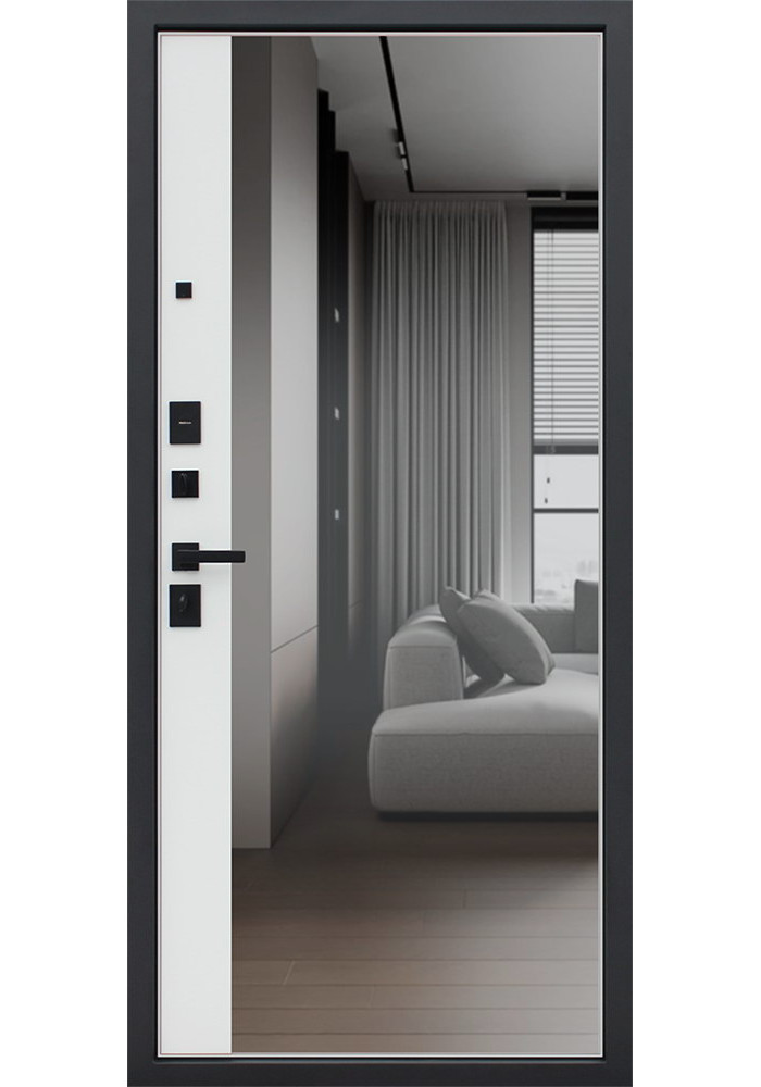 • Наружный лист металла: Наружный лист металла 1,5 мм. Экошпонированная панель МДФ 10 мм (цвет «альянс TF 40 IE-X-89U графит»). Декоративный молдинг 10 мм (цвет «черный»). Наличник гладкий МДФ 80 мм (цвет «черный кварц»)